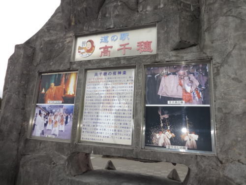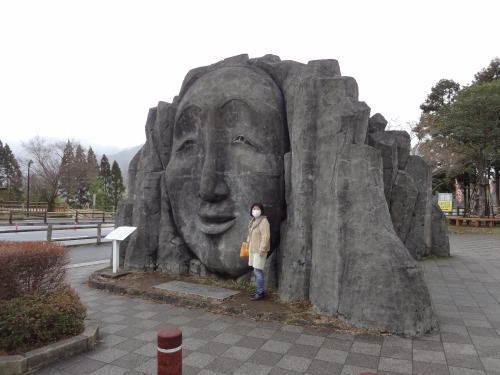 | 高千穂道の駅の前にあるある神楽面をモチーフにした大きな石仏 | 道の駅高千穂は国道218号線沿いにあり、神話と伝説の町らしく神楽面をモチーフにした大きなモニュメントあり、ひむかの神話街道と呼ばれている | |