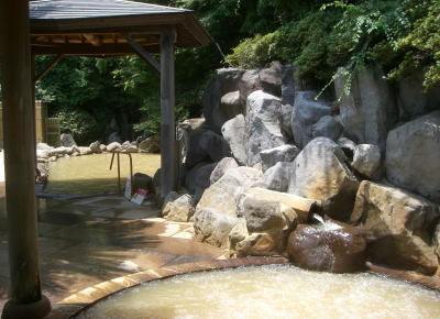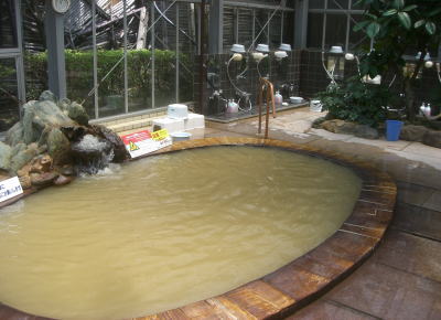 | 露天風呂 泉質はナトリウム炭酸水素塩 茶色のにごり湯であるが本物? 料金は1人800円、次回使用できる200円の割引券がいただけた。 |