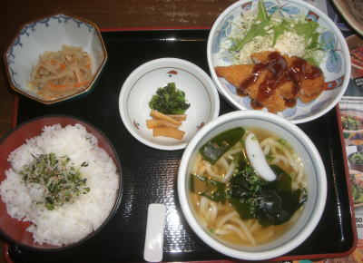 | 北松浦郡江迎町赤坂免にあるレストラン庄屋 良心的な値段で味もおいしくお勧めのレストラン | 日替わりランチ590円で内容はチキンカツ、うどん、小鉢、おしんこ、紫蘇掛ご飯、安くておいしく大満足 |