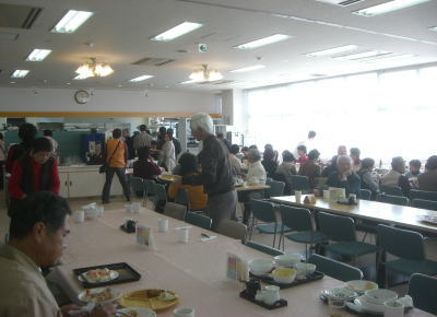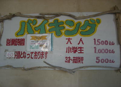 | モンゴル村にあるレストラン。バイキング料金は大人1,500円、小学生1,000円となっているが、子供が好む物はほとんどなし。 | レストラン内部 集会場にあるようなテーブルやいすが並んでいる。メニューは30種類ほど。にぎりもあるけどイカとハマチ、えびの3種類。他、おでんやからあげ等あるがなんとも寂しい。食べた中で一番おいしかったのがモズク。 |