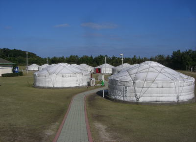 | モンゴル村入り口付近 | モンゴル村のシンボル ゲルが立ち並んでいる |