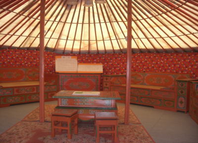 | ゲル村 宿泊施設となっている。1つのゲルで4名まで宿泊可能 | ゲル内部 モンゴルより取り寄せられた本物 |