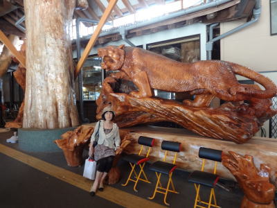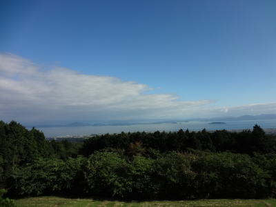 | 大きな丸太から作られたトラの木彫りの前で | みかどホテル近くより熊本方面を眺めたもの 右手は天草 |