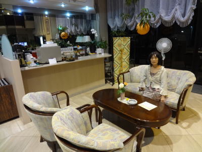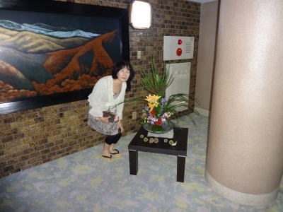 | 夕食後ロビーにて記念撮影 | エレベーター前にある生花の前で |