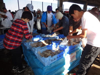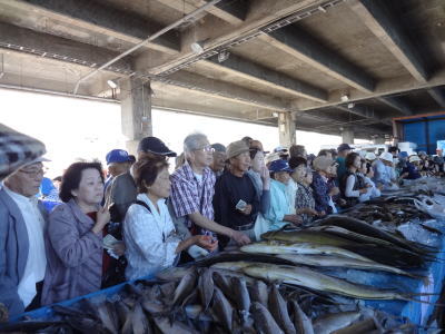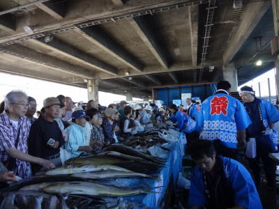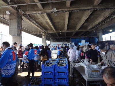 | 発売前の状態。魚はアジ200円、さわら100円、かなやま500円、他にぶりなど | 魚市場の全体的な風景 | |
