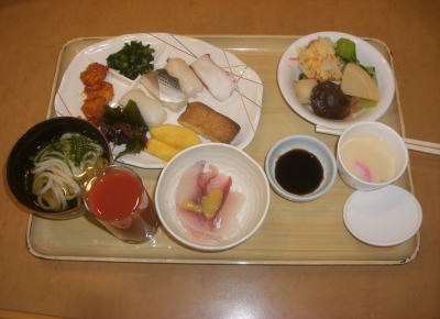 | バイキングレストラン入り口。料金は食事・温泉入浴セットで1,500円 | メニューは40種類程。写真はにぎり(このしろ、みや貝、えび、いか)鯉のあら、茶碗蒸し、えびちり、野菜の煮物、うどん、トマトジュース。他にはさいころステーキ、デザート、パスタ、てんぷらなど多数あり、また味もよく最高。 |