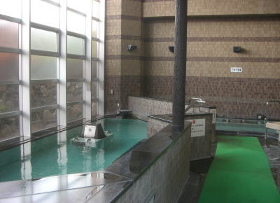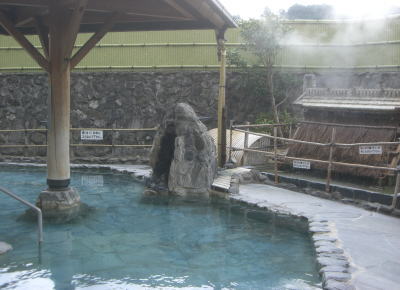 | かんぽの宿 内湯 泉質はナトリウムー炭酸水素・塩化物泉。宿の建物内に入った瞬間には温泉臭が漂っているのが嗅ぎ取れる。本物の温泉 | 露店風呂 写真右側に見えるのが高温の源泉を適温に冷ますための装置。装置自体は笹竹を束ねたところに温泉水ふりかける原始的なもの |
