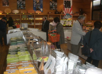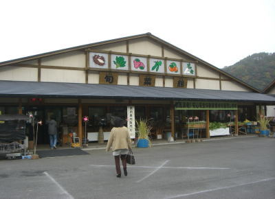 | ”道の駅やまくに” つけものなどの試食がたくさん添えられている | ”道の駅やまくに”の内部。地元産のまんじゅうや乾物が並んでいる | |