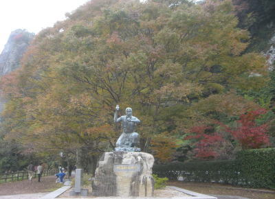 | 禅海和尚の像とバックに紅葉を | 青の洞門付近の紅葉と川を | |