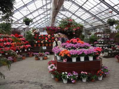 温室の中。バラ等が満開で華やか。入場料1000円は高いと思っていたが、温室の中の花を見れば吹っ飛んでしまった。 | |
