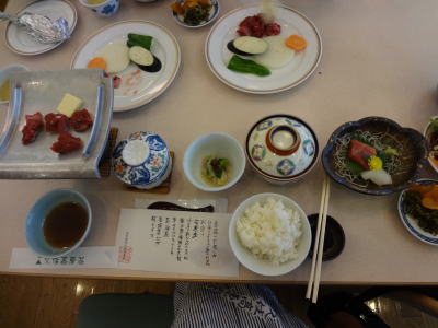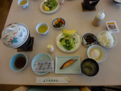 朝食。ごはん、味噌汁、おしんこ、納豆などが自由におかわりすることができ、他にしゃけや温泉卵、のりなどが用意されており大満足。 |