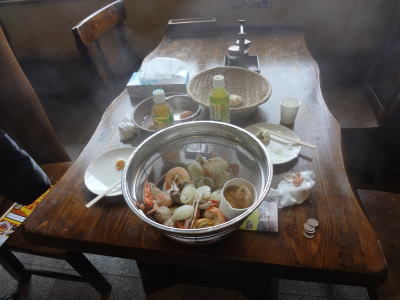 | 地獄蒸し工房入り口で記念撮影 | 海鮮セットは500円とお手頃の値段ながら、サザエが2個、ホタテも2個、他にえび、かに、イカ、ミンチなどと驚くほどの種類が入っている。 | |