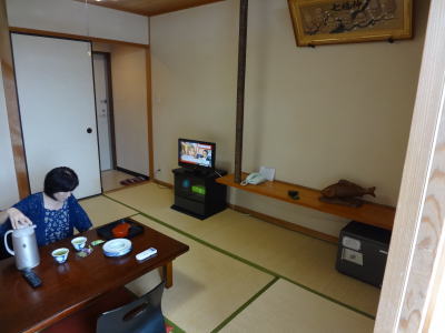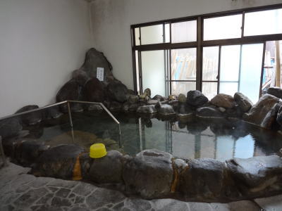 | 8畳の部屋、部屋にある洗面台は水のみの蛇口、お湯も出ない | 男性用大浴場、熱過ぎていくらかき混ぜても入ることが出来ない | |