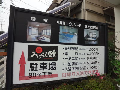 | みはらし館玄関方面より撮影 | 一泊二食8,400円〜。 今回、私たちは11,000円の料金コースであったが | |