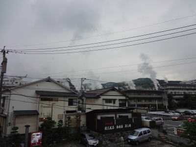 | 部屋からの望んだ鉄輪温泉風景、湯煙るなど見えやしない | 旅館食事処より鉄輪温泉を望んだところ | |