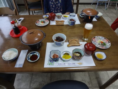 夕食。カニと海老が入った海鮮鍋、ヒラメの刺身、もずく、肉じゃが風の煮込み、茶碗蒸し、塩辛などで、クーポンの写真とはまったく違うお粗末な食事であった |
