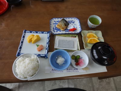 朝食のメニューは海苔、さば塩焼き、卵焼き、明太子、大根おろしらす、お新香、みかん、ごはん、味噌汁。情けなるほどお粗末な朝食である | |