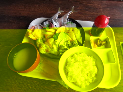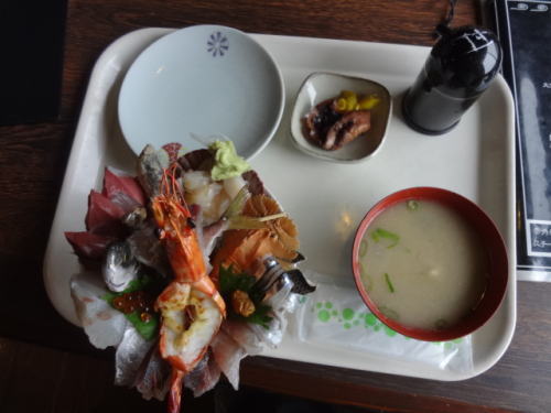 | 塩湯の座席からは海が一望できる | 刺身定食(1000円) はまち、アジ、きびなご、いかなどがあり | |