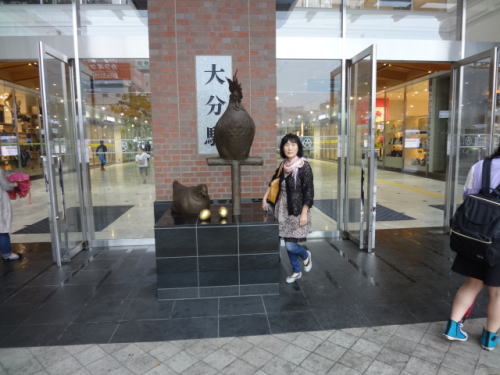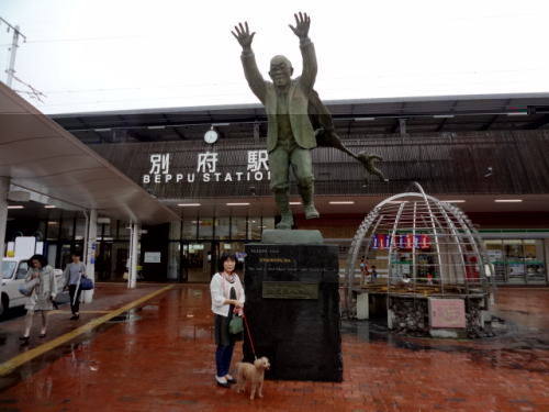| 別府駅 トイと一緒に | ピカピカおじさんこと油屋熊八(別府観光の父)銅像の前で | |