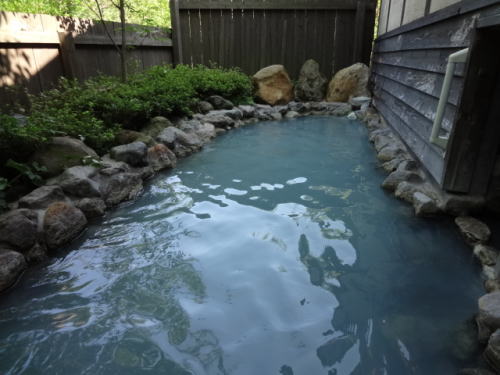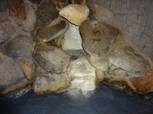 | 岩の部分より温泉水が供給されているが吹き出し部分は湯の花が | さわやかハートピア明礬温泉の露天風呂 温度は適温で気持ちよかった | |
