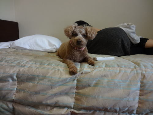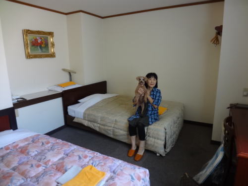 | 部屋の中でのトイ、いつものことではあるが主みたいにわがもの顔で居座る | 翌日の朝方、朝食会場の前で記念撮影 | |