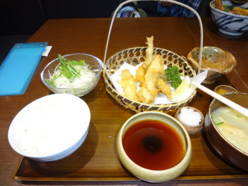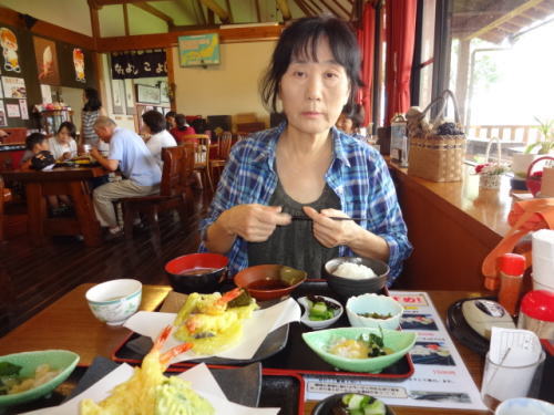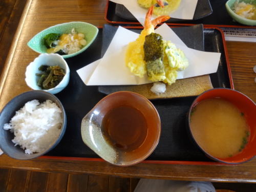 | 昼食は浮羽の道の駅で、メニューは天ぷら定食(900円) | 天ぷら定食天ぷらにはエビ天が2匹入っているし満足、ごはん、味噌汁、お新香お代わり自由 | |