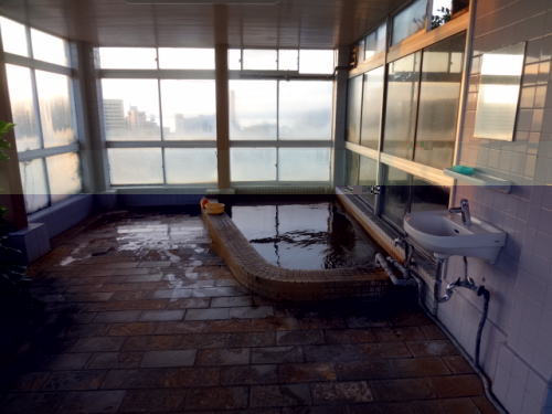 | はやしホテルの7階より別府市街を撮影、正面に見える山は高崎山 | はやしホテル7階にある男子用温泉風呂、温度は少し熱めであったがとても気持ちがよかった | |