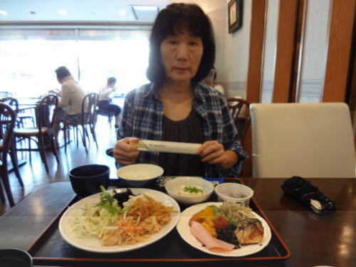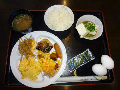 | レストラン・ラギオンでの朝食、サバ塩焼き、納豆、サラダ、ハム、湯豆腐など | 生卵、海苔、スクランブルエッグ、ソーセージ、肉団子、きんぴらごぼう、など | |