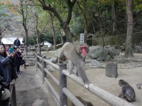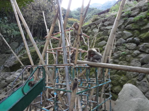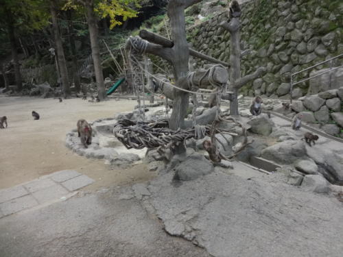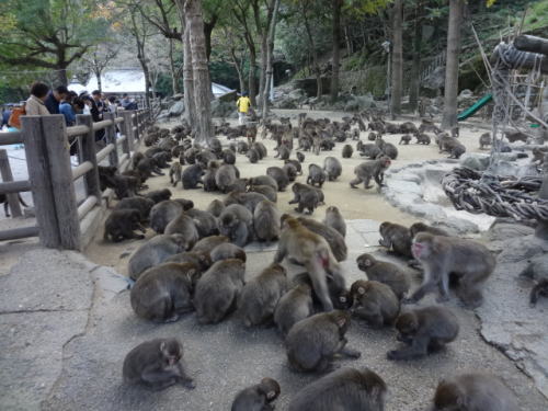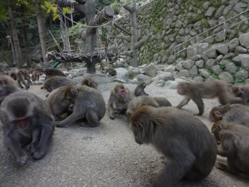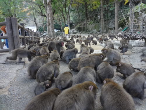 | 小麦の餌やりの後、ほとんどのサルは餌に夢中 | 通常の公園内、サルたちは仲間内でふざけあいながら楽しんでいました | |
