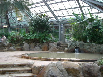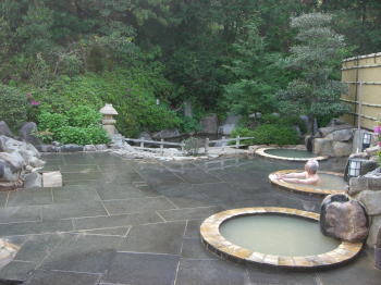 | 広々とした庭園風呂に6〜7個ほどの浴槽が散在。 泉質はナトリウム炭酸水素ナトリウムとなっていますが茶色っぽいにごり湯となっていますので何か混ぜてあるのかも。 |