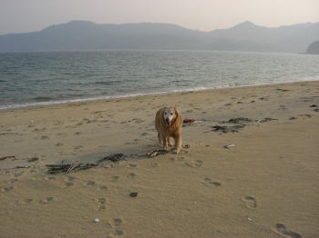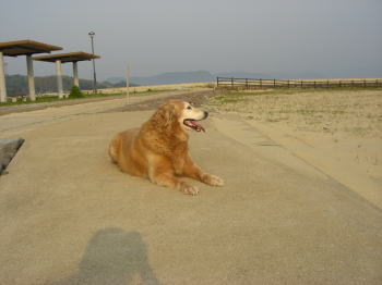 | ホテル前の砂浜でポチ散歩。周りは人影もなっかたので日頃味わえない開放感で、ポチにとっても充分満足しました。 | 走り廻り過ぎで息切れしている状態。 | |||||||||||||||||||||||||||||||||