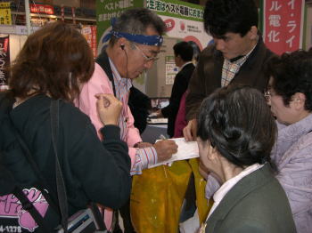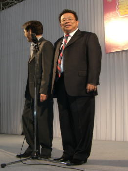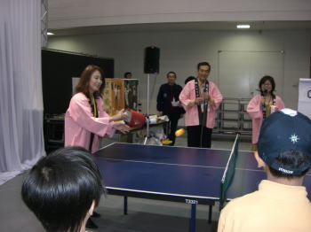 | 安藤豊アナウンサーと一緒にスリッパ卓球大会 | 会場いたるところでアナウンサーの方がサービス 写真は中西一清さん |