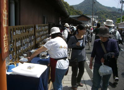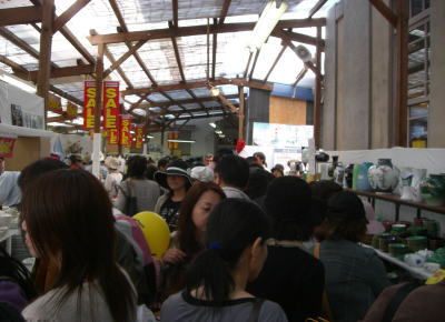 | 今日が初日ということもあるのか、多くの人盛りである | 陶器市の中にはお店もいろいろある。写真は壁掛けの焼き物が並んでいる |