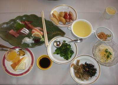 | 1,200円のお手ごろ値段でバイキングのメニューは刺身盛り合わせ、冷麦、デザート類、など多彩で満足いく内容でした | レストランより中庭を眺めたもの、贅沢な作りでゆったりとした気分になりました |