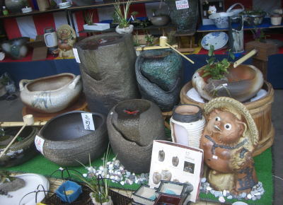 | 狸の置物などが展示しているお店。他には金魚の水槽なども | 有田陶器市では珍しい焼き物が並んでいました |