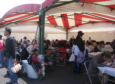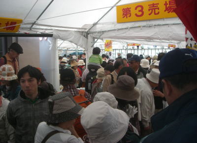 | 今年は物産展も開催されていました。海茸と帆立の粕漬けとメカブを買ってきました | 物産館の休憩所は、やきとりや弁当などを購入した人で満員状態 |