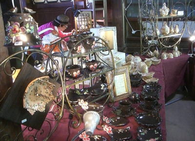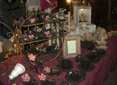 | 陶器市のある店で、おしゃれな焼き物が売られていました | おしゃれなコーヒカップが2,500円程、花柄などが施されています |