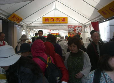 | 通りの片隅ではテレビの取材が行われていました | 橋の傍にある大安売り店。今年は初日ということで値引きはいまいち |