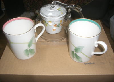| 今年に購入した一部、香蘭社のペアマグカップと有田焼きの茶濾しが付いたガラス製の急須 | 香蘭社の店の中は人でいっぱい |