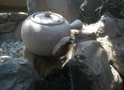 | 露店風呂に立てられている立て札 | 露店風呂では大きな石の急須よりお茶のエキスが入ったお湯が注がれている |