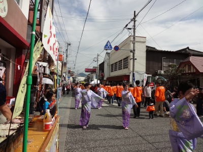 | 地元の会社や有志の人たちによる踊りながら温泉街中心部をパレード | ||