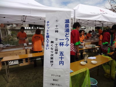 | まつりの一環には「湯どうふフェスタ」も開催され、湯豆腐が一杯50円で売られている | 湯豆腐と同時に「あげ豆腐」も一杯50円で売られている | |