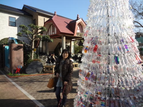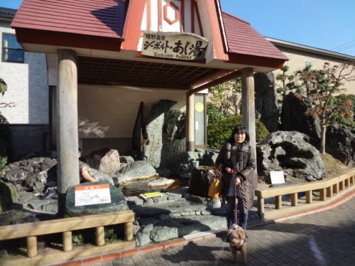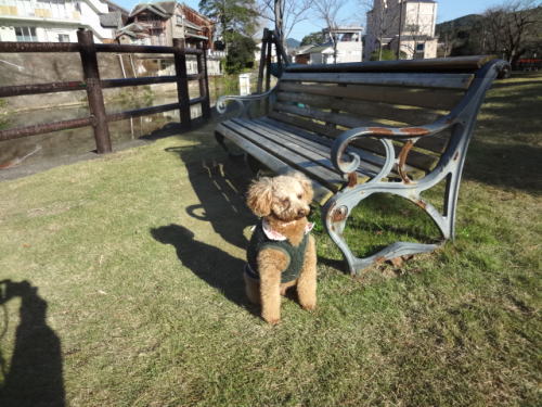 | シーボルト足湯前の広場、ペットボトルで作られたツリーが飾られている | シーボルト温泉のそばにある温泉公園でトイ君を散歩、この日は天気が良かったので大喜びでした | |