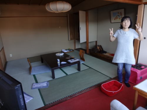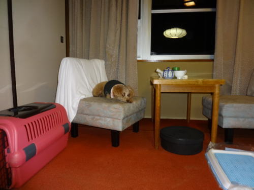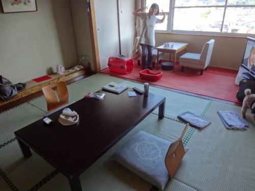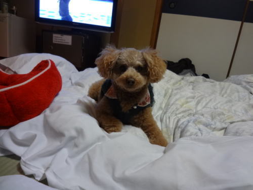 | トイは布団を敷いたならば待っていましたとばかり布団の上で遊びまわります | トイは旅館の中でも我物がをで振る舞いソファーなども独占 | |