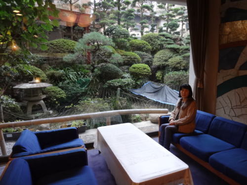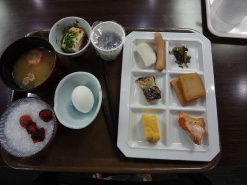 | 朝食はおかゆに鮭、焼き魚、さつま揚げ、卵焼き、ソーセージ、豆腐、ゆで卵などをいただきました | 1階のロビーで記念撮影、庭の手入れもきちんとされておりくつろげる場所でした | |