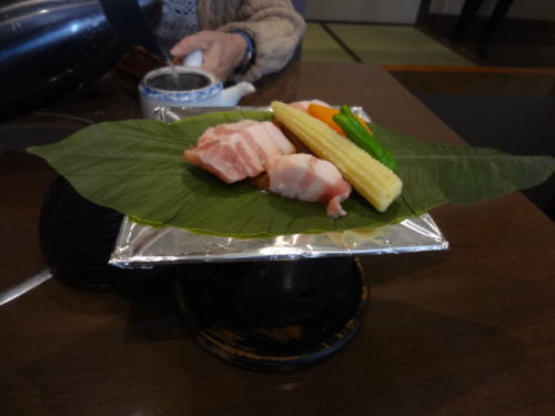 | お昼の和会席+1杯+日帰り入浴+砂むし(3490円)を膳座敷 季味でいただく | 豚肉の鉄板焼き | |||||
