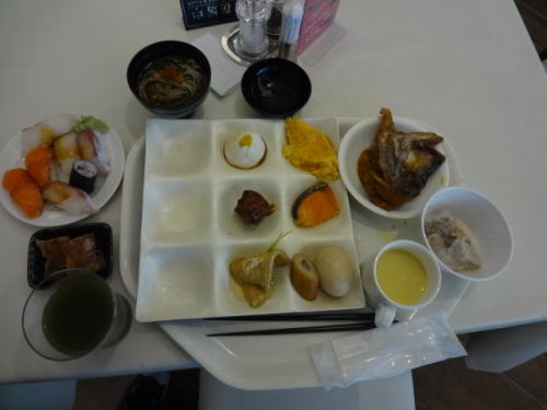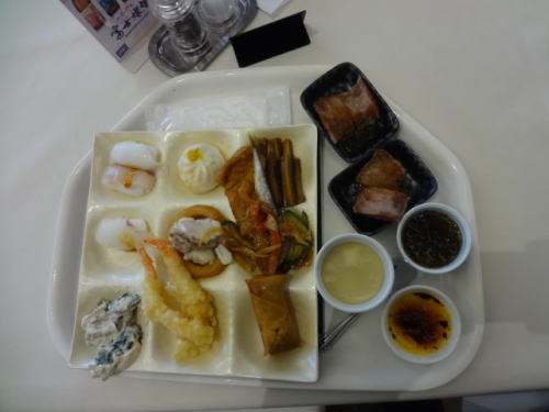 | 一番最初にチョイスした料理、タイのアラ、ステーキ、クリーム煮込みのハンバーグ、小籠包、おでん、そば、握り寿司緑色野菜ジュース、コーンスープなど | 妻の最初のチョイス料理、エビ天、春巻き、ステーキ、もずく、ししゃも、タイの握り寿司、 スイーツなど |