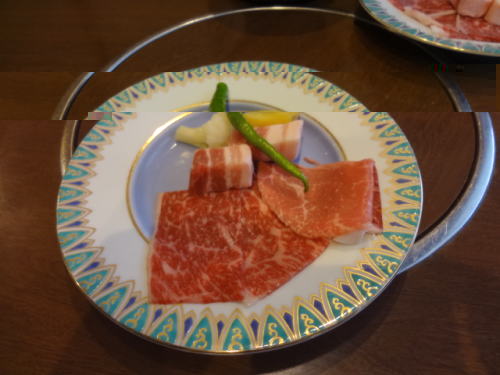 | イワシの焼き物と同じであるがカリフラワーを外した料理 | 焼き肉用の豚肉と牛肉のロース、カルビーなど | |