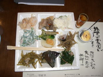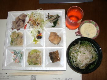 | 殆ど野菜ばかりのメニュー。内容は焼きなす、れんこんの煮物、酢物など等、右側のお椀はうどん、その上は茶碗蒸し、その横は健康ジュース | こちらも殆ど同じ内容。メニューとしては40〜50種類あるかと思うが似たり寄ったり。 | |||||||||||||||||||||||||||||||||