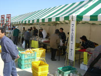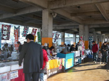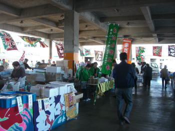 | 魚市場内に設けられたフェスタ会場の直売所 | 盛大なイベントとなっているがオープン直後のためお客はまばら | |||||||||||||||||||||||||||||||||